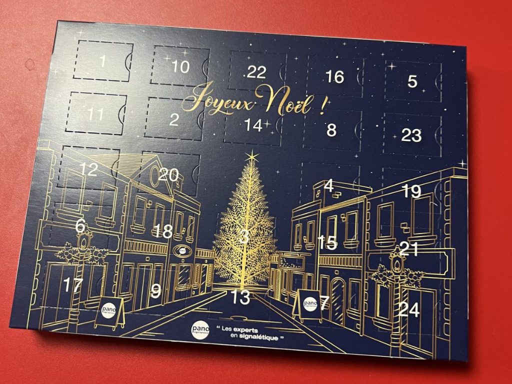 - Produits gourmands (dans un sachet ou boîte personnalisé) : bonbons, chocolats, biscuits, calendrier de l’Avent gourmand, etc.